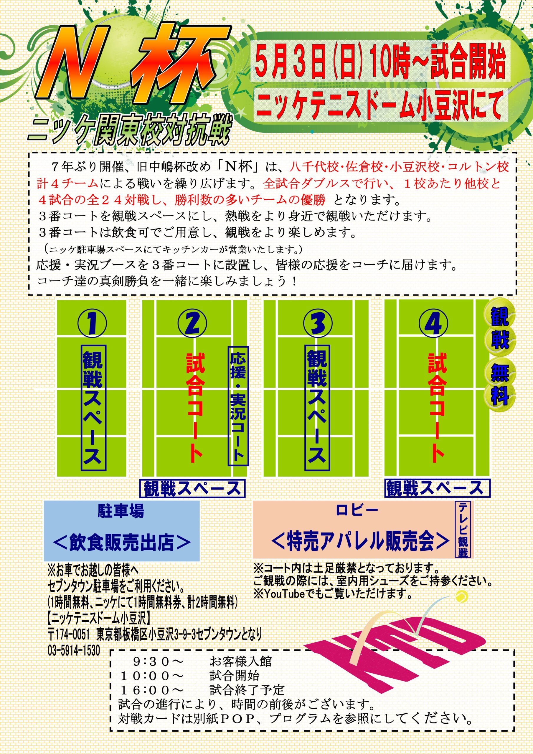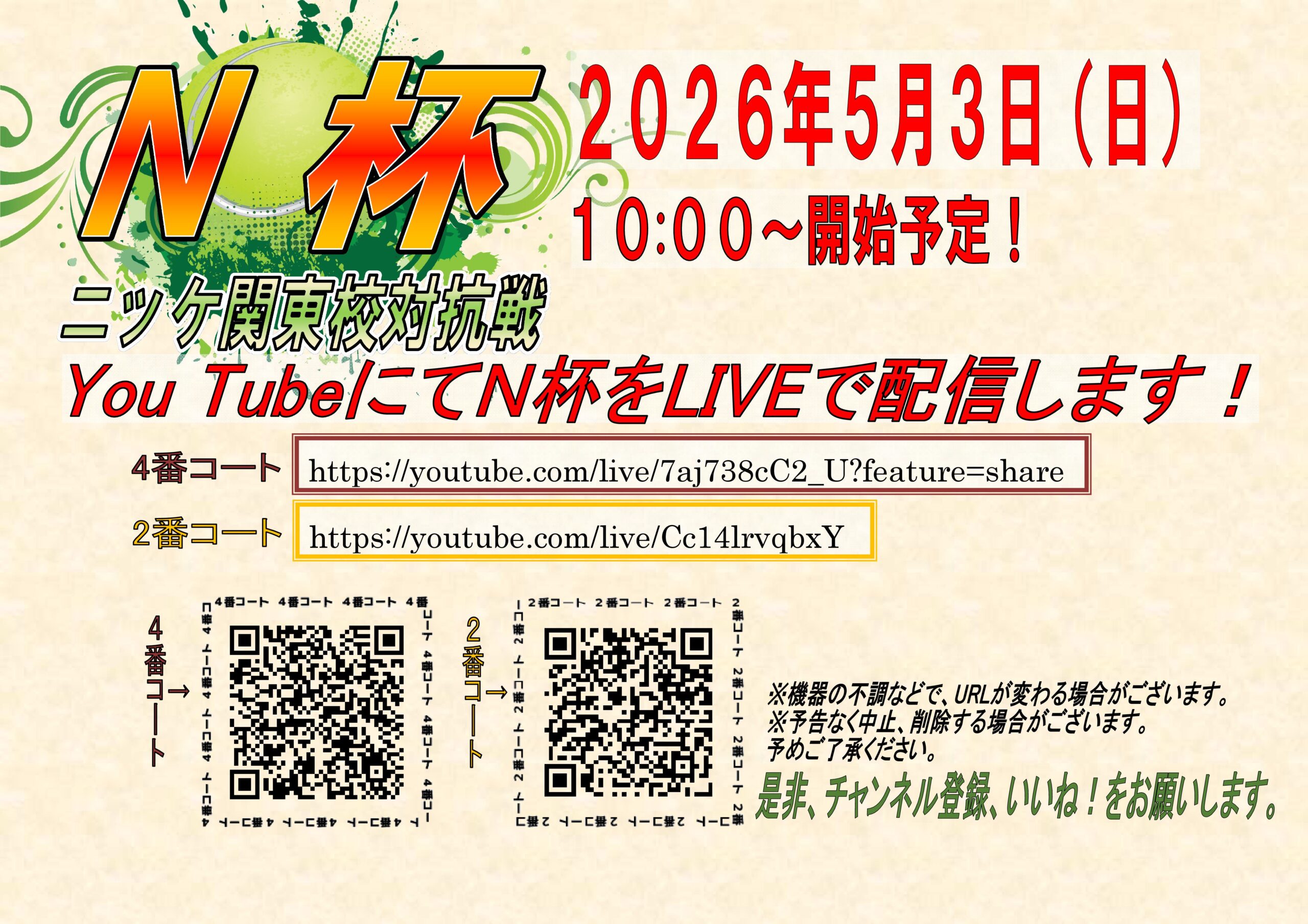 イベント&新着情報 5/3 コーチ達の熱い戦い!「N杯」開催‼ 2026年04月17日 当日のライブ配信はこちら↓ 2番コート 4番コート « 第71期 コーチとエンジョイダブルス A1の部 結果報告‼