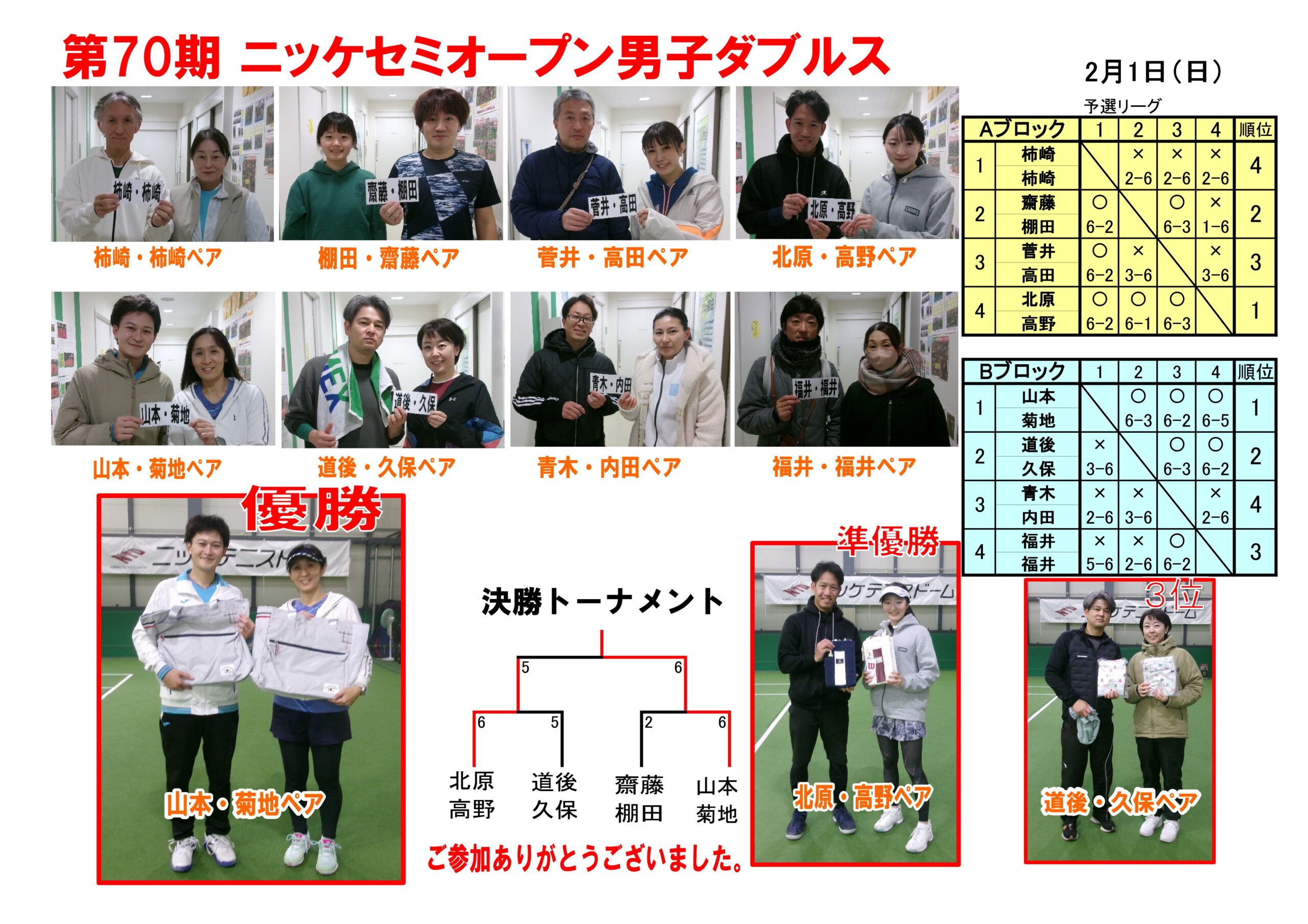 イベント&新着情報 第70期 セミオープンミックスダブルス 結果報告‼ 2026年02月08日 第70期 セミオープン男子ダブルス 結果報告‼ 2026年02月01日 みきお・すぐるレッスン&対抗戦 開催‼ レッスンしたり、一緒に試合をしたり、応援したり! 2026年01月27日 第70期 コーチとエンジョイダブルス A2の部 結果報告‼ 2026年01月25日 第70期 コーチとエンジョイダブルス A1の部 結果報告‼ 2026年01月18日 1 / 3812345...102030...»最後 »