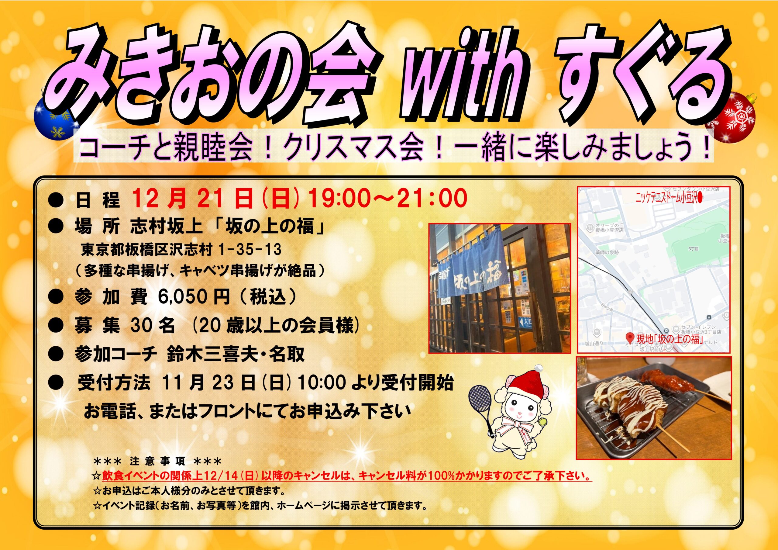 イベント&新着情報 Xmasイベント 「みきおの会 withすぐる」 開催‼ 2025年11月13日 « 第69期 セミオープンミックスダブルス 結果報告‼ ジュニア恒例イベント「第5回紅白大運動会」開催‼ »